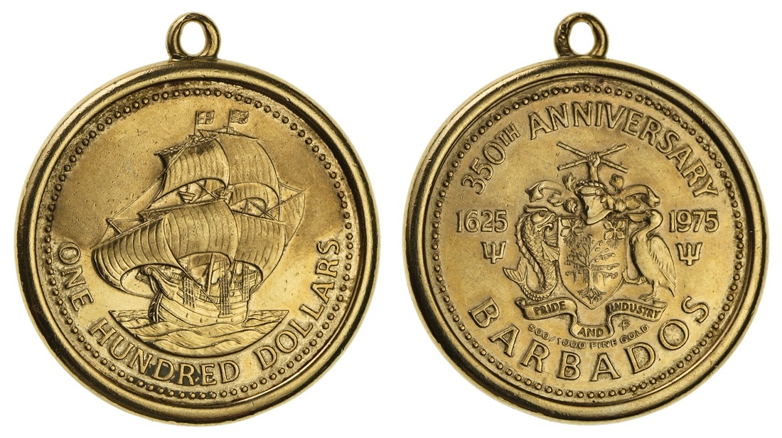 Barbados. 100 Dollars, 1975. 350th Anniversary. English ship. KM 18. Extremely Fine. Set in a gold bezel.