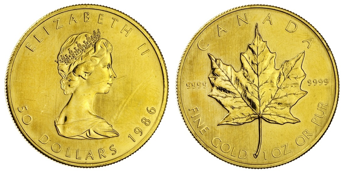 Canada. Elizabeth II (1952-2022). 50 Dollars, 1986 - 1 OZ Fine Gold. Young bust right, rev. Large maple leaf. Frosted devices. KM 125.2. Obverse scuff. Brilliant Uncirculated.
