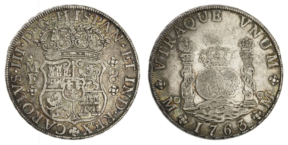 Mexico. Carlos III (1759-1788). 8 Reales, 1763 Mo MF. Mexico City. Dos Mundos types. KM 105. Iridescent hues over some minor contact marks. Very Fine.