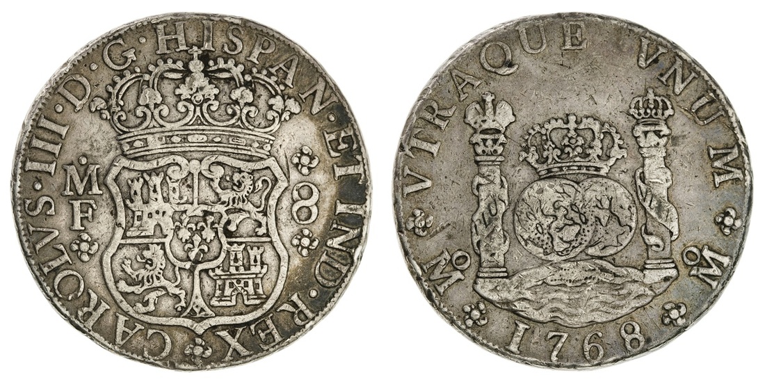 Mexico. Carlos III (1759-1788). 8 Reales, 1768 Mo MF. Mexico City. Dos Mundos types. KM 105. Some obverse nicks. Toned. About EF.