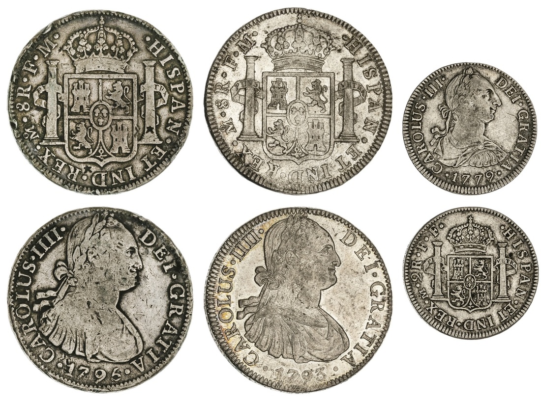 Mexico. Colonial trio: Carlos III (1759-1788). 2 Reales, 1779 Mo FF. Armored bust right. KM 88.2. Some obverse scratches. VF; Carlos IV (1788-1808). 8 Reales, 1793 and 1795 Mo FM. Armored bust right. KM 109. The first, good lustre, VF; the latter some tiny chops and a few small rim bruises, Fine+. (3)