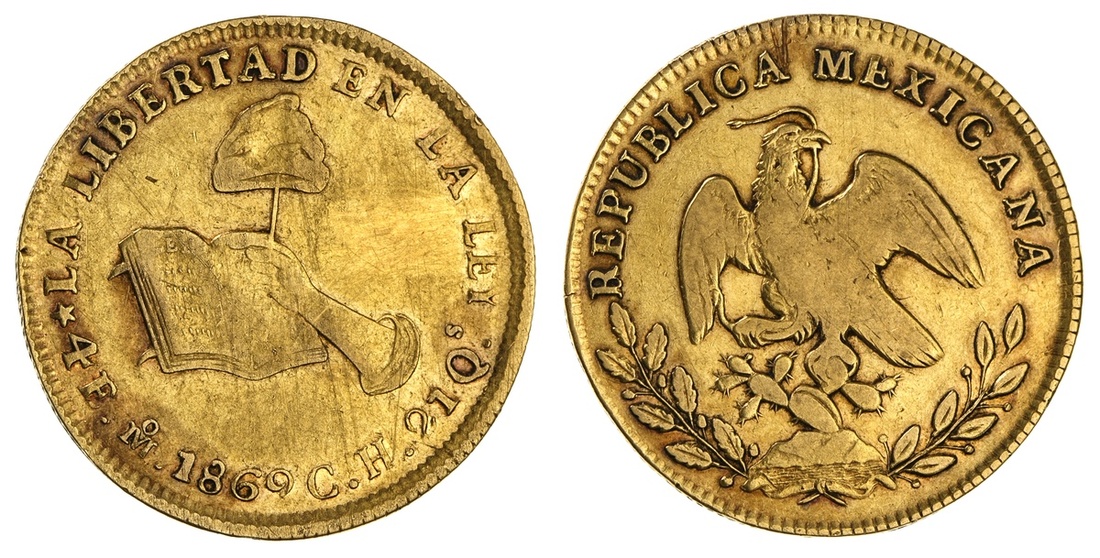 Mexico. Republica. 4 Escudos, 1869 Mo CH. Mexico City. Hand inscribing law book with quill topped by Liberty Cap, rev. Eagle facing, snake in beak, atop cactus. Fr. 77, KM 381.6. Obverse fields lightly scratched and tooled. Very Fine.