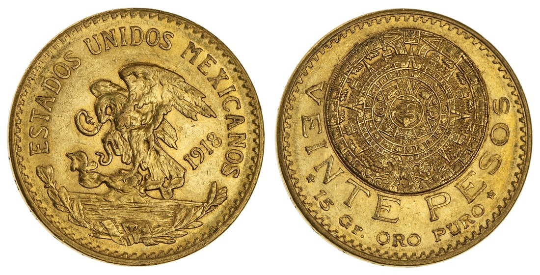 Mexico. Estados Unidos. 20 Pesos, 1918. Eagle left, standing on cactus, snake in beak, rev. Piedra del Sol Aztec calendar. KM 478. Extremely Fine.