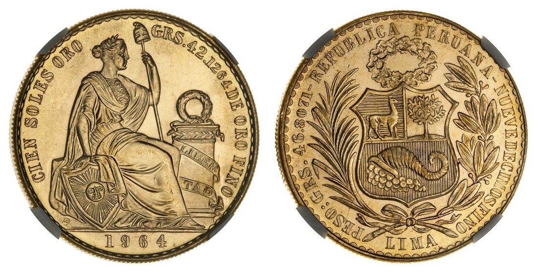Peru. Republica. 100 Soles, 1964. Libertad seated right, rev. Arms within wreath. KM 231. Mintage of 11,000. NGC MS 64.