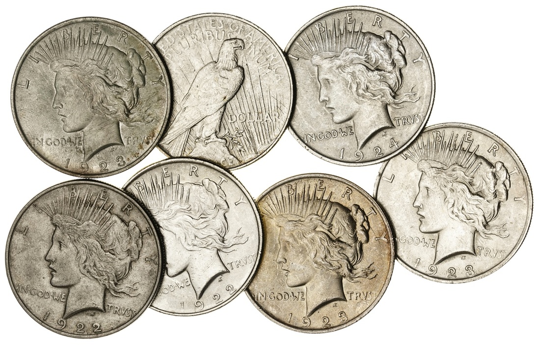 A Septet of Peace Dollars: 1922 (3), 1923 (3), and 1924. One VF-EF, the others AU-Unc. (7)