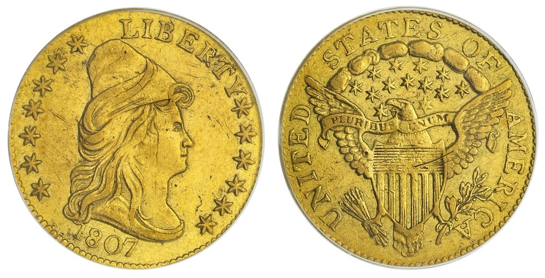 1807 $2 1/2 Capped Bust. BD-1, HBCC-3016. R-3. PCGS Genuine. Code 98 (surface damage). Pleasing olive-orange tone over some scattered hairlines and contact marks. AU Details. Ex Stack's-Bowers, Baltimore, April 2, 2011, lot 6222.