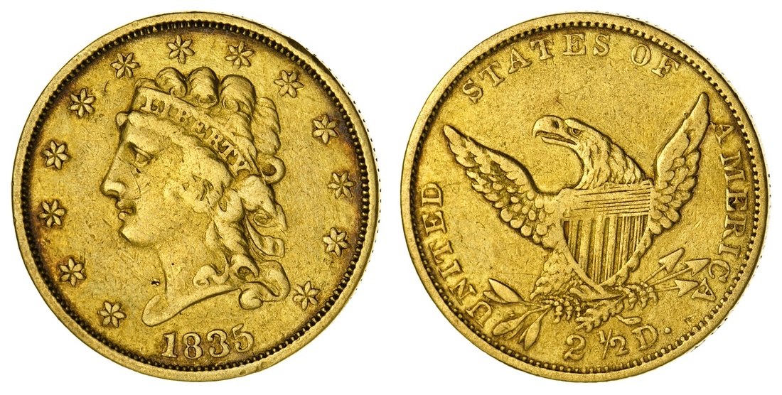 1835 $2 ½ Classic Head. Fine+. Tiny dig, once wiped, now toned.