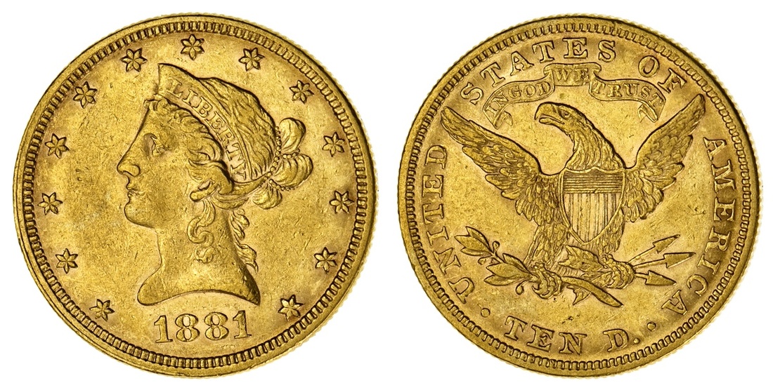 1881 $10 Liberty. About EF. Once lightly cleaned.