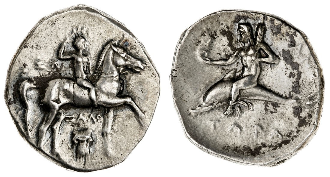 Calabria. Tarentum. AR Stater, ca. 280-272 BC. 6.56 gms. Youth on horseback right, crowning himself, Z(omega) upper left, ZA(lambda)O and Ionic capital below, rev. Phalanthos, holding aplustre and distaff, riding dolphin left. Vlasto 803-7, HN Italy 1014. Light deposits reverse. Very Fine.