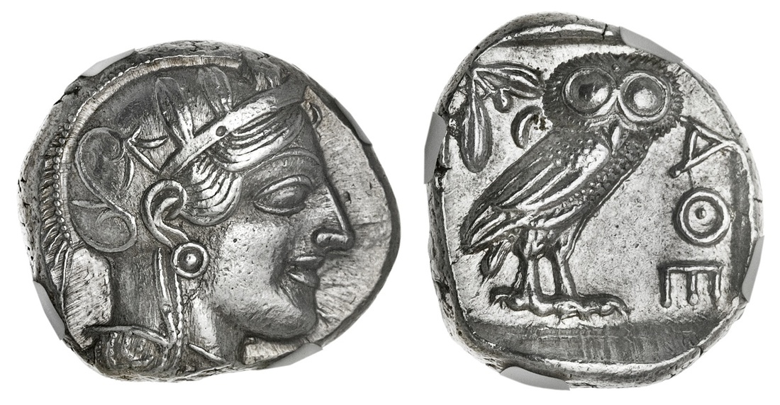 Athens. AR Tetradrachm, ca. 454-404 BC. 17.21 gms. Helmeted head of Athena right, rev. Owl standing right, head facing, closed tail feathers, olive sprig and crescent behind; all in an incuse square. Kroll 8, SNG Copenhagen 31. NGC AU, Strike: 5/5; Surface: 4/5.