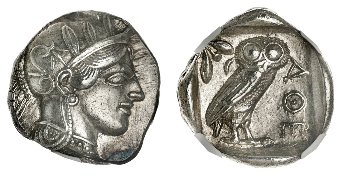 Athens. AR Tetradrachm, ca. 454-404 BC. 17.18 gms. Helmeted head of Athena right, rev. Owl standing right, head facing, closed tail feathers, olive sprig and crescent behind, all in an incuse square. Kroll 8, SNG Copenhagen 31. NGC AU, Strike: 5/5; Surface: 4/5.
