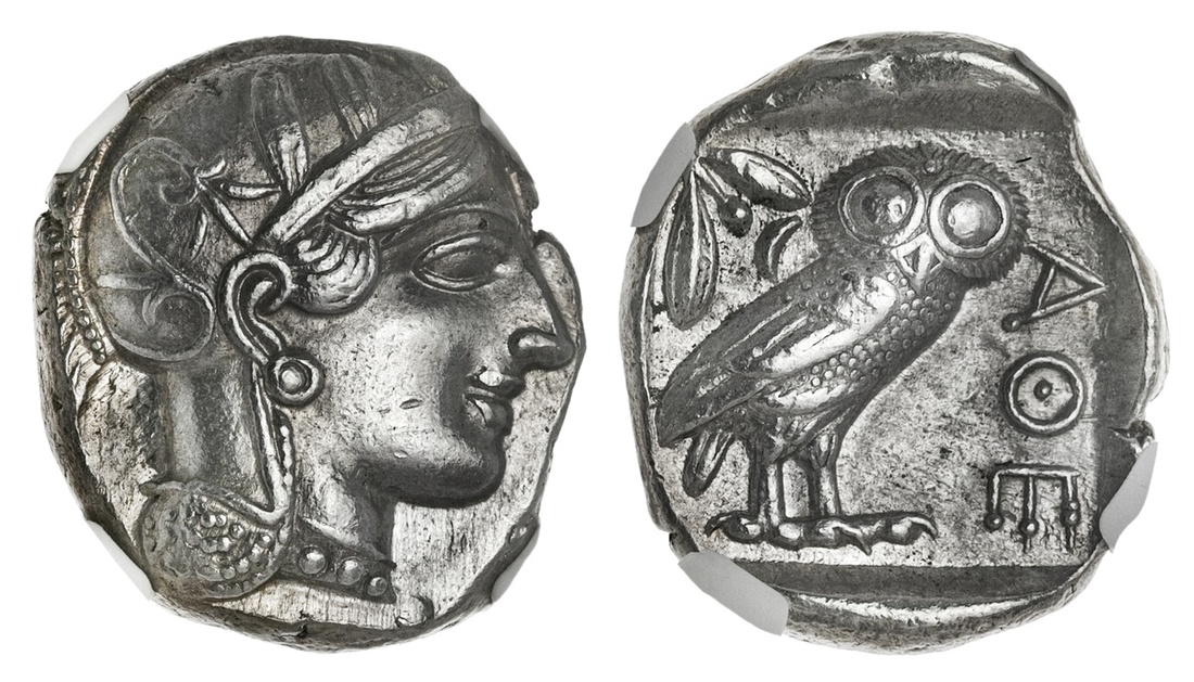 Athens. AR Tetradrachm, ca. 454-404 BC. 17.19 gms. Helmeted head of Athena right, rev. Owl standing right, head facing, closed tail feathers, olive sprig and crescent behind, all in an incuse square. Kroll 8, SNG Copenhagen 31. NGC AU, Strike: 5/5; Surface: 3/5.