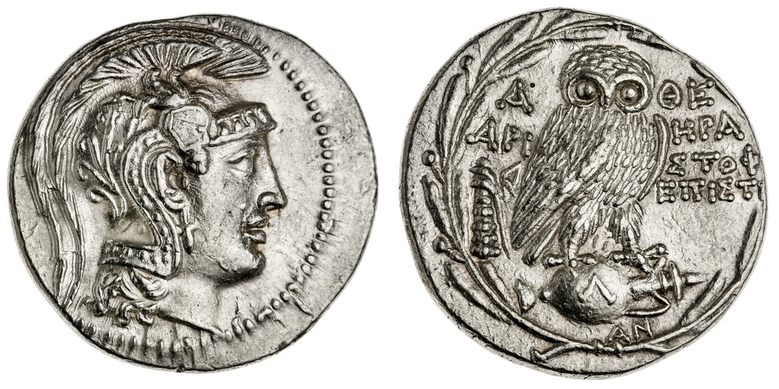 Athens. AR "New Style" Tetradrachm, struck 136/5 BC. Magistrates: Hera--, Aristoph--, Epistr--. 16.85 gms. Helmeted head of Athena right, rev. Owl standing facing on amphora, club with lion's skin at left, lambda on amphora, AN below. Thompson 339b. Good Extremely Fine.