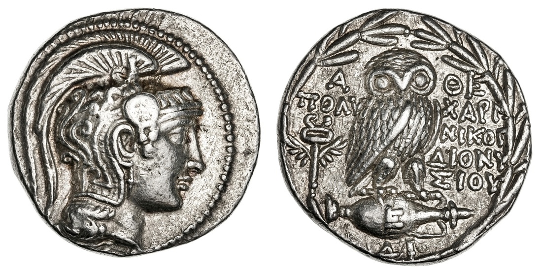Athens. AR "New Style" Tetradrachm, struck 133/2 BC. Magistrates: Polycharm--, Nikog--, Dionysio. 17.04 gms. Helmeted head of Athena right, rev. Owl standing facing on amphora, winged caduceus at left, E on amphora, deltaI below, magistrates names across. Thompson 378d. Extremely Fine.