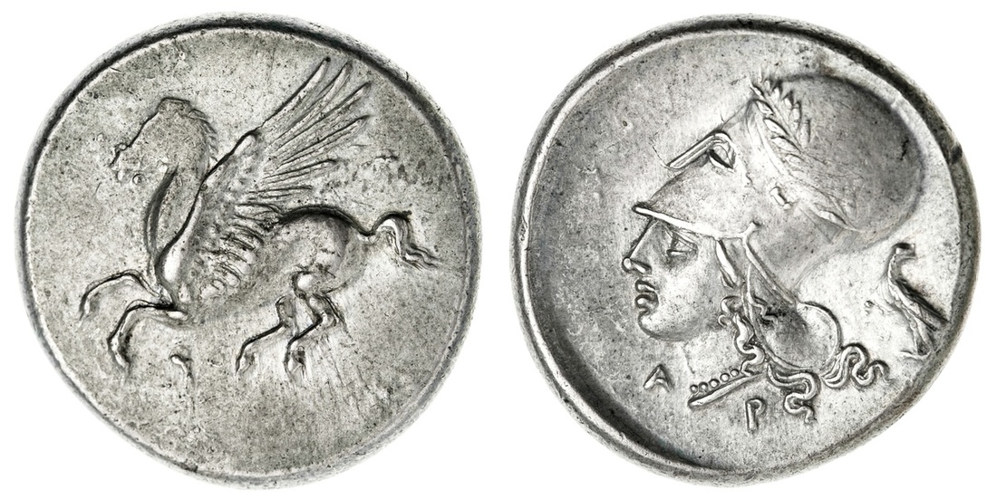Corinth. AR Stater, 350/45-285 BC. 8.53 gms. Pegasos flying left, rev. Helmeted head of Athena left, A-P, eagle behind. Ravel Period V, 1008; Pegasi 426; HGC 4, 1848. Near Extremely Fine.