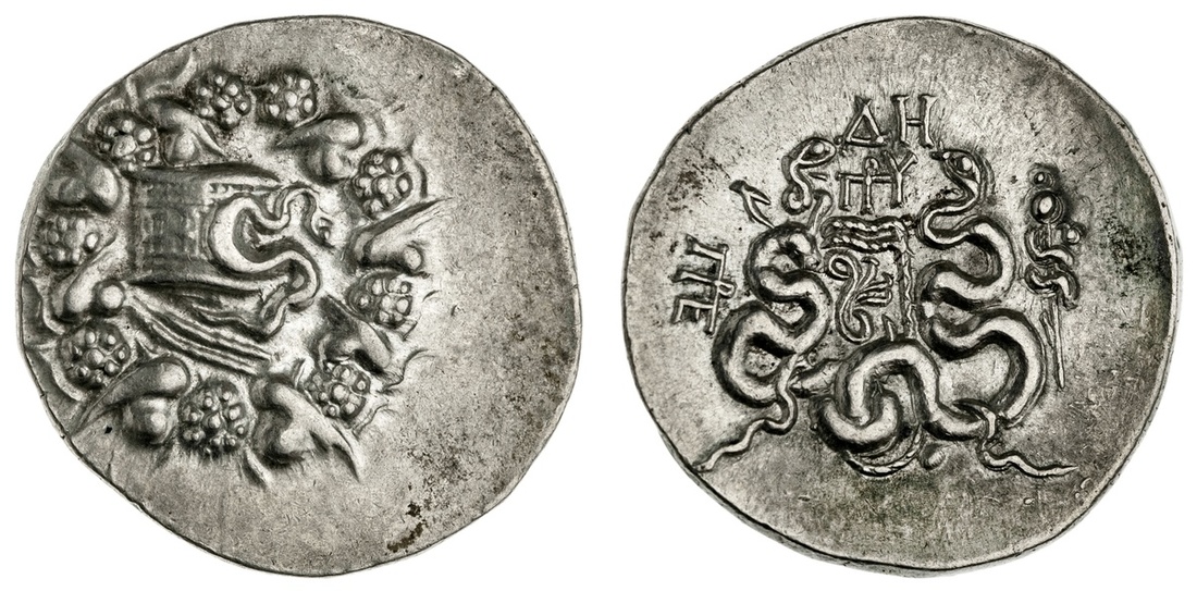 Mysia. Pergamum. AR Cistophoric Tetradrachm, ca. 92-88 BC. De--, prytaneis. 12.6 gms. Cista mystica, serpent emerging, within ivy wreath, rev. Two serpents entwined around a bow and quiver, deltaH and prytaneis monogram above, civic monogram at left, thyrsos at right. Kleiner Hoard 31, SNG BN 1732-3. Good Very Fine.