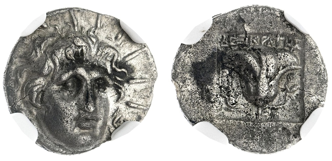 Islands of Caria. Rhodes. AR Hemidrachm, ca. 170-150 BC. Plinthophoric Series. Magistrate: Dexikrates. 1.19 gms. Helios head slightly right, rev. Rise with bud right, Isis crown at left, magistrate's name above, all within incuse square. Jenkins Rhodian Group B, 45; SNG Keckman 657. NGC Ch XF; Strike: 5/5; Surface: 3/5, edge chip (very small).