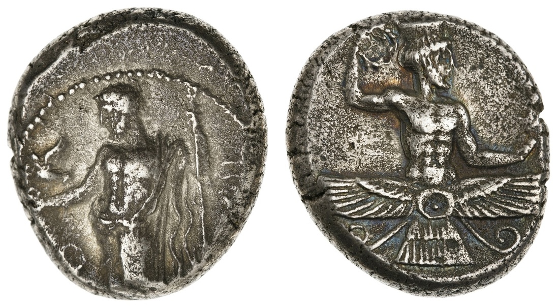 Cilicia. Mallos. Tiribazos, Satrap of Lydia (388-380 BC). AR Stater, struck 387/6-381 BC. Baal standing left holding eagle and lotus-tipped scepter, rev. Ahura-mazda facing, head right, body terminating in a solar disk with wings and tail feathers. SNG Levante 148, SNG France 390, SNG Copenhagen 165, SNG van Aulock 5713. Rare. Grainy. Very Fine.