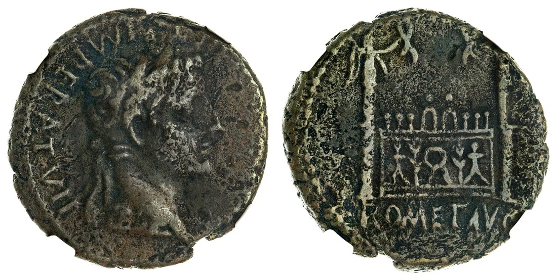 Roman Imperial. Tiberius, as Caesar (AD 4-14). AE As. Lugdunum (Lyon), struck under Augustus, AD 13-14. 9.79 gms. Laureate head right, rev. Altar of Lugdunum decorated with corona civica between laurels flanked by figures, Victories on columns. RIC (Augustus) 245. NGC VF; Strike: 4/5, Surface: 3/5.
