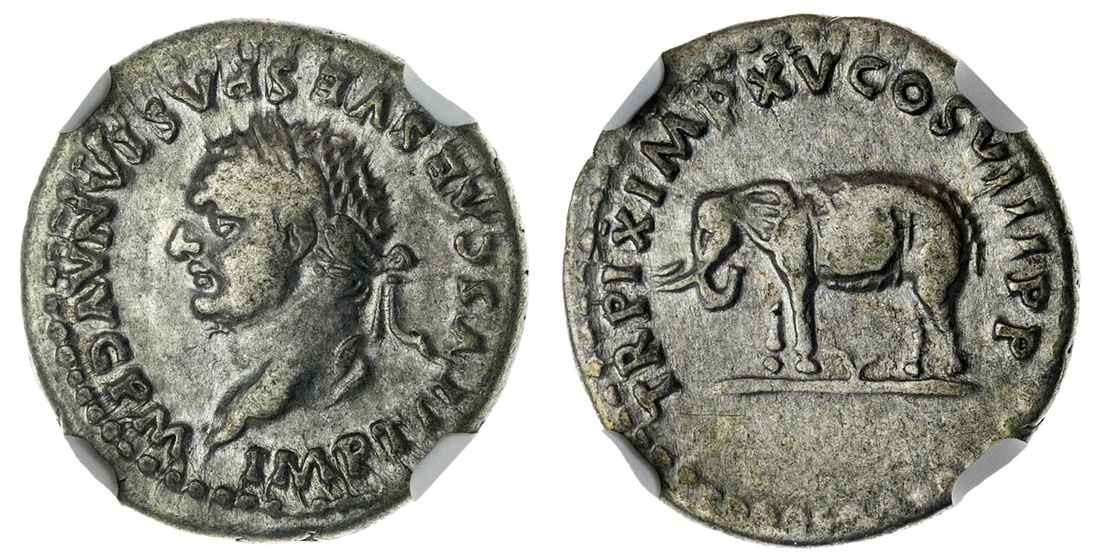 Roman Imperial. Titus (AD 79-81). AR Denarius. Rome, struck AD 80. 3.09 gms. IMP TITVS CAES VESPASIAN AVG P M, laureate head left, rev. TR P IX IMP XV COS VIII PP, elephant wearing armor. walking left on exergual line. RIC 116, BMCRE 47-8, BN 41. Rare with head left. NGC VF; Strike: 5/5; Surface: 3/5.