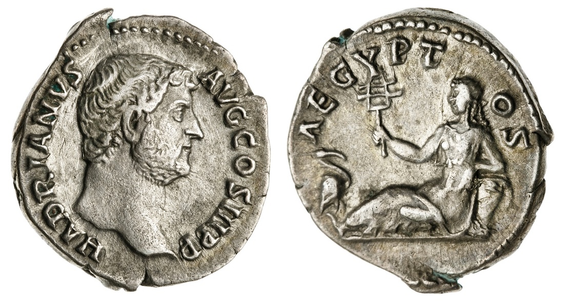 Roman Imperial. Hadrian (AD 117-138). AR Denarius. Travel Series issue. Rome, struck ca. 130-133. 3.27 gms. Laureate head right, rev. AEGYPT-OS, Egypt reclining left, resting arm on basket and holding sistrum, an ibis standing right at her feet. RIC 297, RSC 99. Near Extremely Fine.