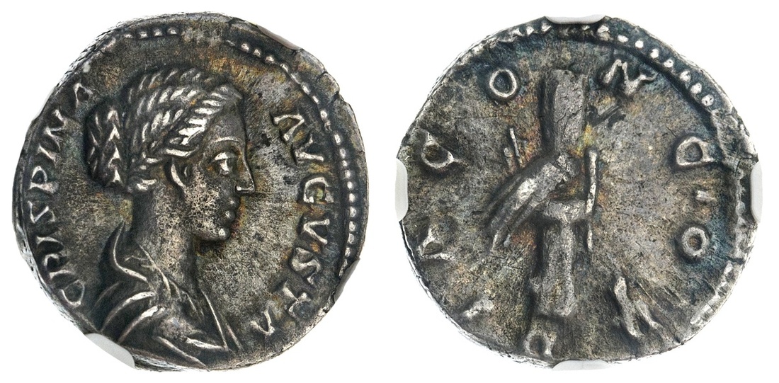 Roman Imperial. Crispina, Augusta (AD 178-182). AR Denarius. 3.10 gms. Draped bust right, rev. Clasped hands. RIC (Commodus) 279B, RSC 8. NGC XF; Strike: 3/5, Surface: 4/5.