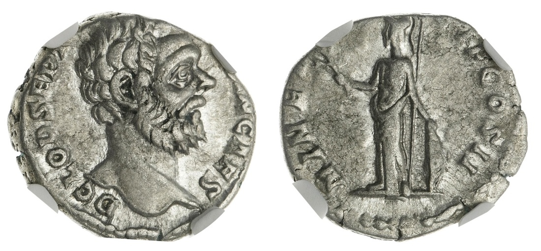 Roman Imperial. Clodius Albinus, as Caesar (AD 195-197). AR Denarius, struck under Septimius Severus, AD 194-195. 3.08 gms. Bare head right, rev. Minerva standing left holding olive branch and shield set on ground with spear. RIC 7, RSC 48. NGC XF; Strike: 3/5; Surface: 4/5.