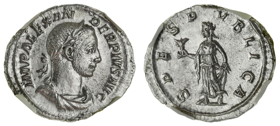 Roman Imperial. Severus Alexander (AD 222-235). AR Denarius, AD 232 3.04 gms. Laureate, draped bust right, rev. Spes advancing left, holding flower and raising hem of her dress. RIC 254, RSC 543. NGC Ch XF; Strike: 5/5, Surface: 3/5.