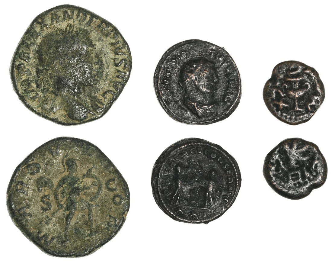Roman Imperial. Severus Alexander (222-235 AD). AE Sestertius, AD 232. Laureate bust right, slight drapery, rev. Mars advancing right holding spear and shield. RIC 635. Olive green, earthen hues. Fine; also a Licinius AE and a Jewish War Prutah. Fine. (3)