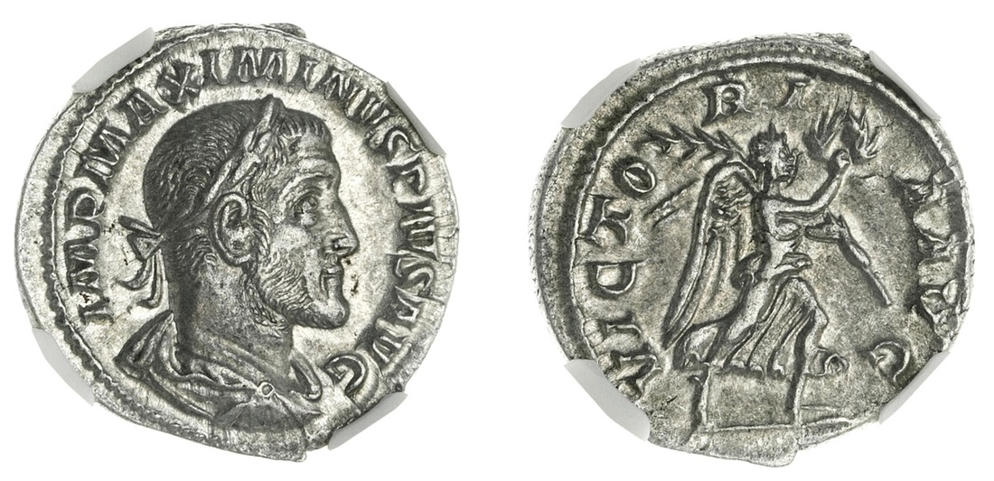 Roman Imperial. Maximinus I (AD 235-238). AR Denarius, AD 236. 2.91 gms. Laureate, draped and cuirassed bust right, rev. Victory advancing right holding wreath and palm frond. RIC 16, RSC 99a. NGC AU; Strike: 5/5; Surface: 5/5.