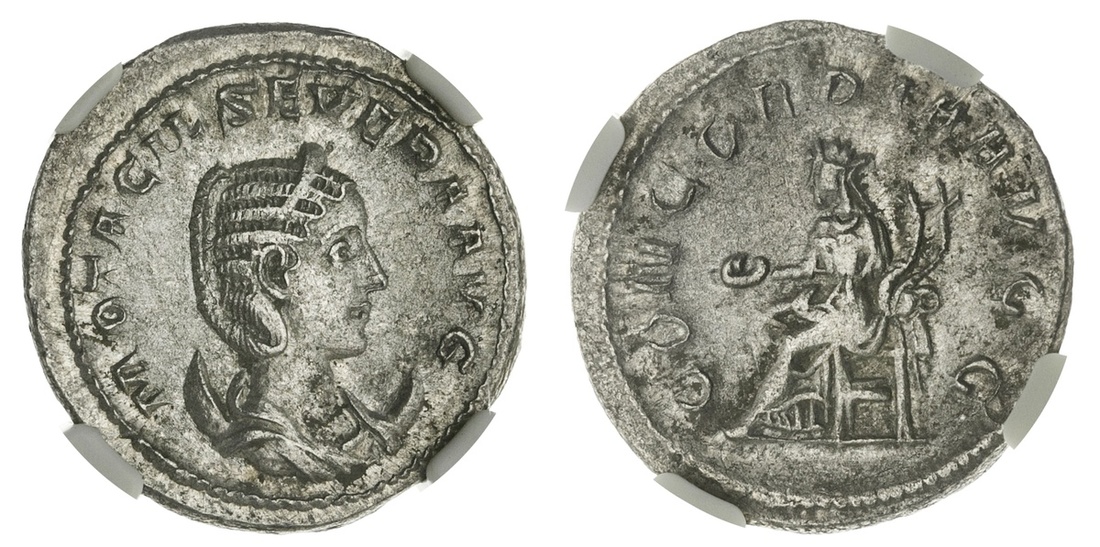 Roman Imperial. Otacilia Severa, Augusta (AD 244-249). AR Antoninianus. Draped bust right, wearing stephane, set on crescent, rev. Concordia seated left holding a patera and double cornucopia. RIC (Philip) 125c, RSC 4. NGC Ch XF.