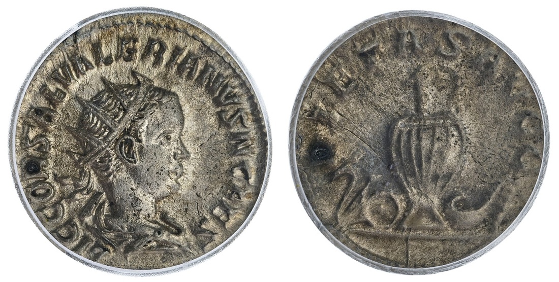 Roman Imperial. Saloninus, as Caesar (255-259). AR Antoninianus. Rome, struck AD 255-257. LIC COR SAL VALERIANVS N CAES, radiate and draped bust right, rev. PIETAS AVGG, emblems of the pontificate: lituus, secespita, patera, guttus, simpulum and aspergillum. RIC 26, RSC 49. ICG AU 50. Lightly toned, sharp strike. About as Struck.
