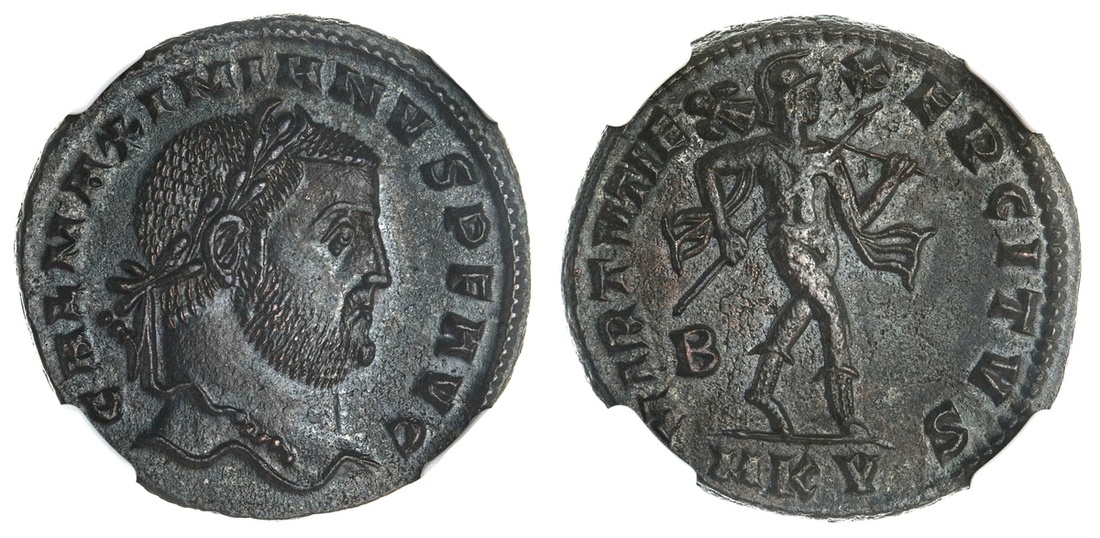 Roman Imperial. Galerius (AD 305-11). AE Follis. Cyzicus, struck ca. AD 308-309. 6.99 gms. Laureate head right, rev. Mars advancing right holding spear, trophy and shield, B left field, MKV in ex. RIC 47. NGC Ch AU; Strike: 5/5, Surface: 3/5.