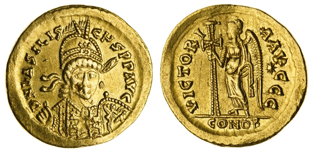 Roman Imperial. Eastern Empire. Basiliscus (AD 475-476). AV Solidus. Constantinople. 4.5 gms. DN bASILIS-CuS PP AVG, diademed and helmeted bust facing slightly right, holding spear over shoulder and shield adorned with a horseman, rev. VICTORI-A AVGGG. Victory standing left, holding long voided cross, star in right field, CONOB in ex. RIC 1003, MIRB 1a, Depeyrot 101/1. Small die flaw at center, otherwise Good Very Fine.
