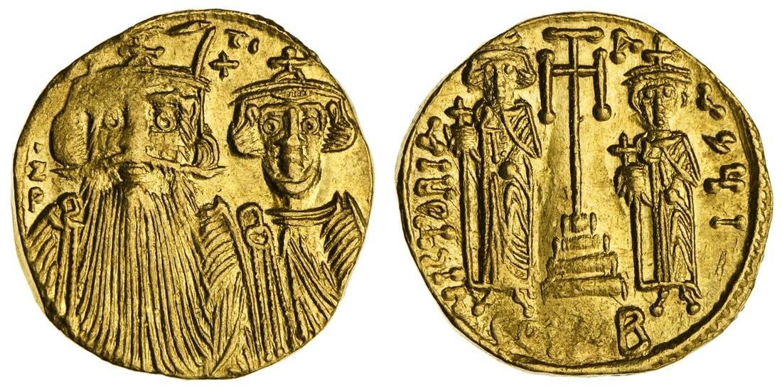Byzantine Empire. Constans II, with Constantine IV, Heraclius and Tiberius (641-668). AV Solidus. Constantinople, 10th officina, struck 662-667. 4.30 gms. Crowned and draped facing busts of Constans and Constantine, small cross between them, rev. Cross potent on three steps flanked by Heraclius and Tiberius each holding a globus cruciger, legend ends "I"; CoNoB in ex (weakly struck). DOC 30j, MIB 31, SB 964. Near Extremely Fine. Ex CNG Sale 91, Sept. 19, 2012, lot 1080.