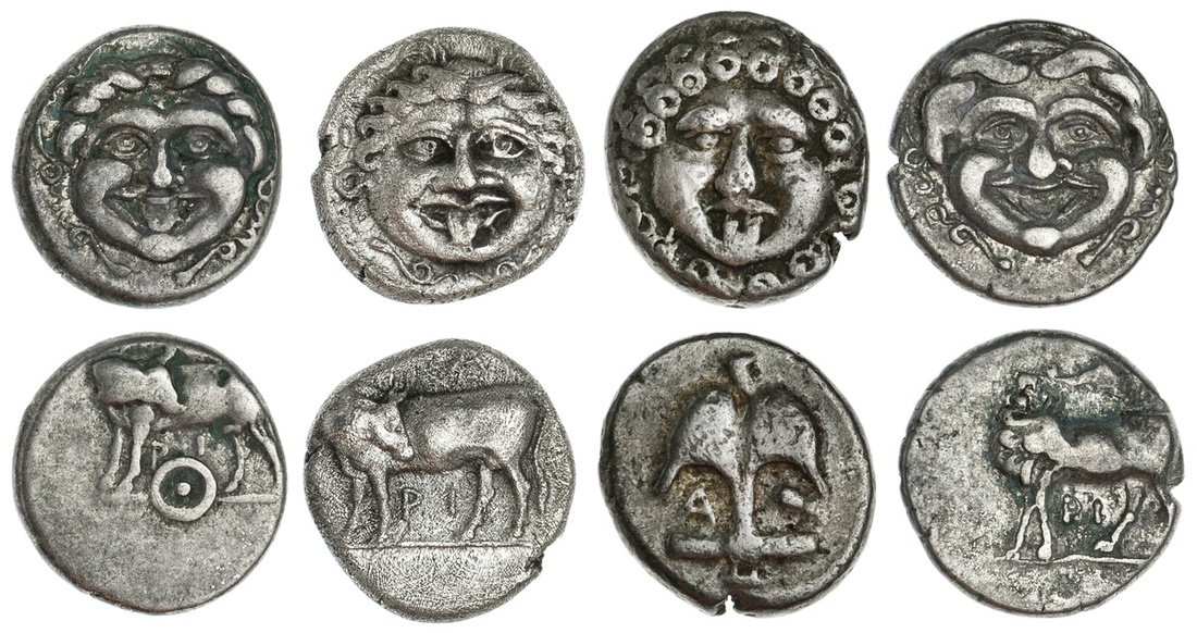 Group of Ancient Greek AR Fractions with facing gorgoneion. Includes: Thrace. Apollonia Pontika ca. 450-390 BC. Tetrobol. 2.79 gms. Rev. Upright anchor, A-crayfish. About VF; and Mysia. Parion. Hemidrachm (3), 4th Century BC. 2.37, 2.37 and 2.35 gms. Revs. Cow standing left head reverted - PI below (2), PI with patera below. One grainy, VF. (4)