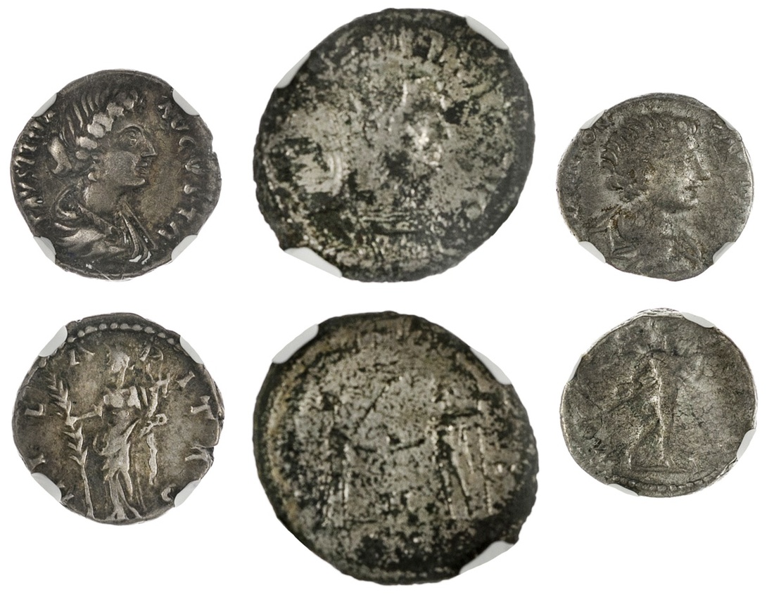 Roman Imperial. Trio of NGC encapsulated issues. Faustina (AD 147-175/6). AR Denarius. Rev. Felicitas standing left. VF; Strike: 4/5, Surface: 3/5; Caracalla, as Caesar (196-198). AR Denarius. Rev. Mars right. Ch F; and Tacitus (275-276). Billon Antoninianus. Rev. Emperor receiving globe from Jupiter. VF; Strike: 4/5, Surface: 2/5. (3)