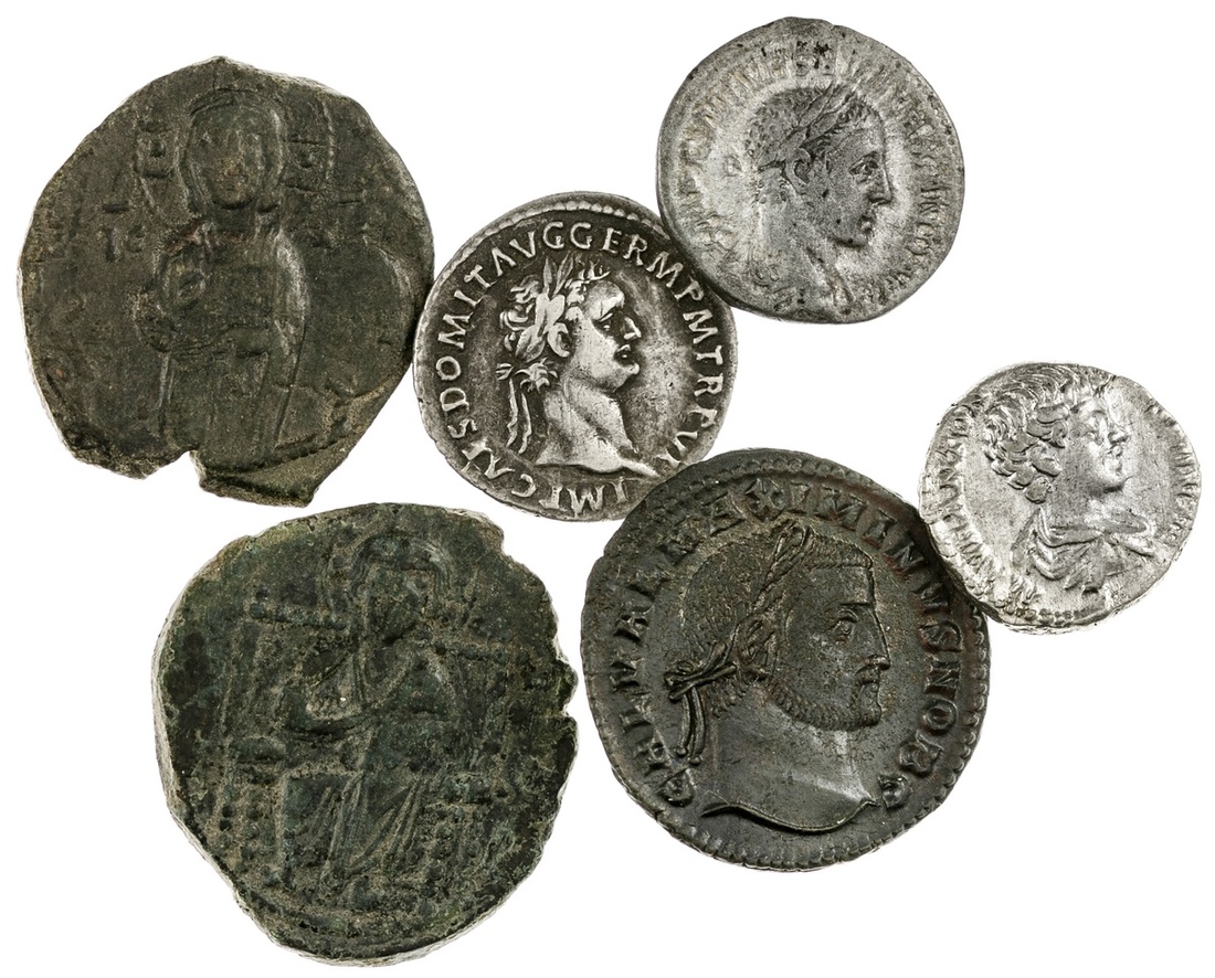 Roman Imperial Lot. Includes: AR Denarii of: Domitian, AD 81-96. Struck AD 87. Rev. Minerva advancing right. Light deposits, a few scratches. VF; Caracalla, as Caesar, AD 196-196. Rev. Fides standing right holding basket of fruit and corn-ears. Good VF; and Severus Alexander, 222-235. Rev. Jupiter seated left. About VF; and AE Follis of Maximinus II, as Caesar, 305-309. Cyzikus, 3rd officina. Rev. Genius left with patera and cornucopia, gamma left, star behind, MKV in ex. Good VF; also: Byzantine AE Christ Folles (2) - enthroned, standing. About VF-VF. (6)