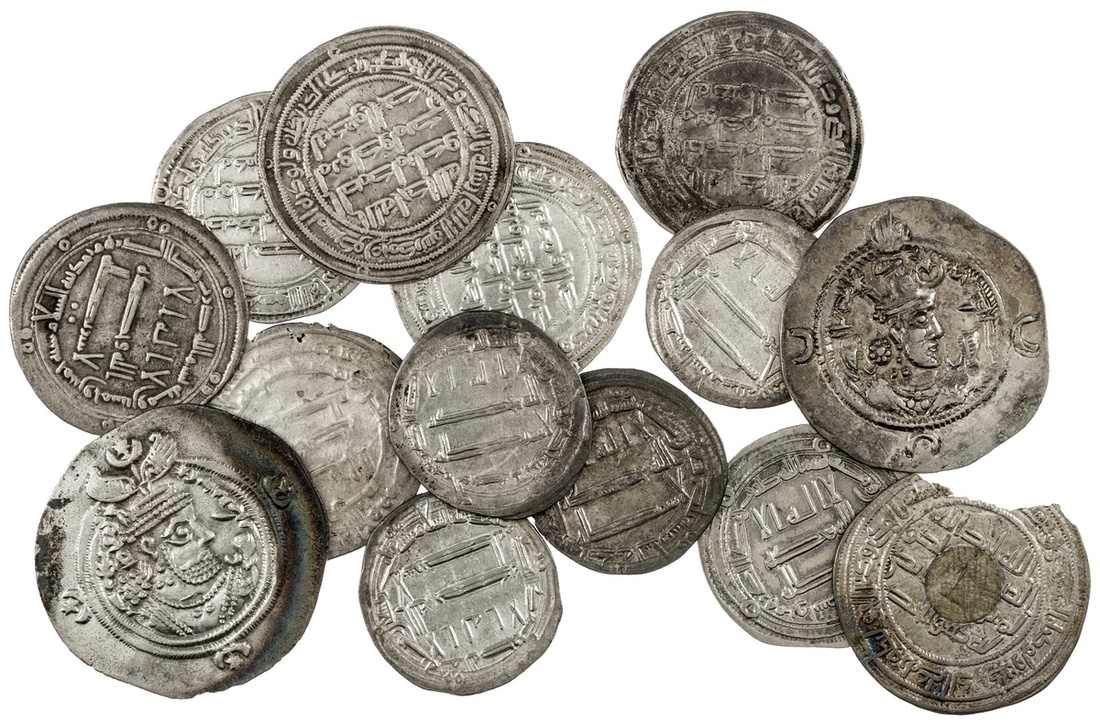 Group of Umayyad and Abbasid AR Dirham. Umayyad: Wasit AH 95 (2), 104, 123, 125; Abbasid: Madinat al-Salaam AH 155, 190, 193 (2), 242 (struck from eroding dies) and Muhammadiya AH 191. About VF-Choice EF; also: Sasanian AR Drachm (2) and a broken Umayyad Dirham. (14)