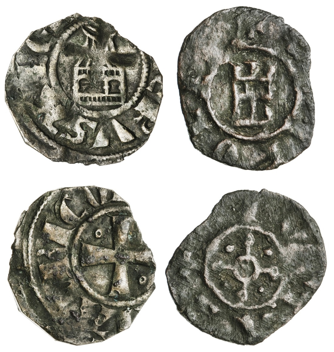 Crusaders pair. Kingdom of Jerusalem. Amaury (1163-1174). Billon Denier. 0.55 gms. Church of the Holy Sepulcher. Metcalf 114, CCS 27. Break at edge. About VF for type; and County of Tripoli. Bohemond V. AE Pougeoise. 0.51 gms. Cross with central annulet, pellet each quarter, rev. Creneleted tower. Sabine type 6, CCS 21. Good Fine. (2)