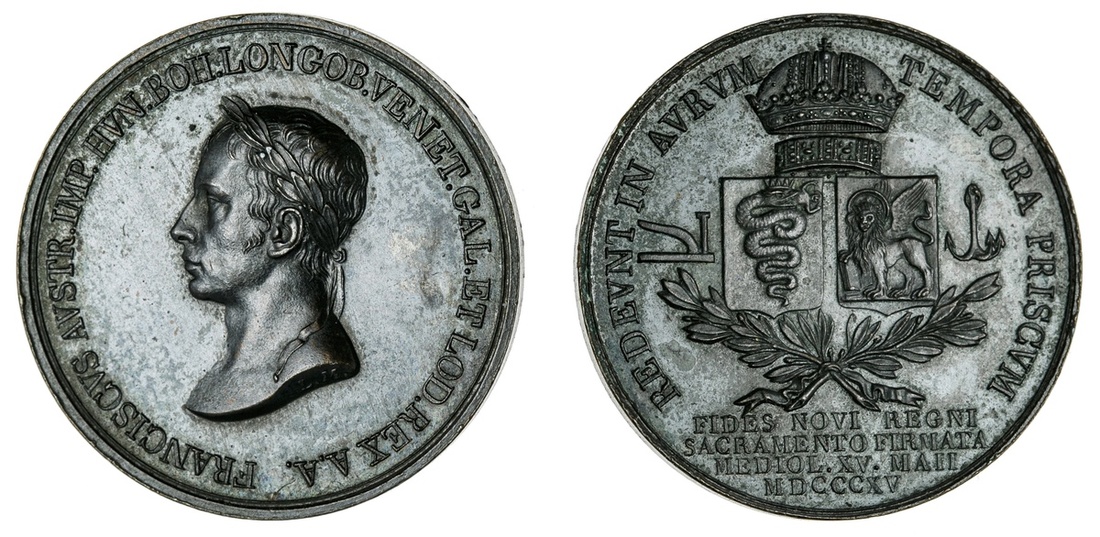 Austria. Francis II (1804-1835). Homage in Milan, 1815. Medal. Bronze, 30.5mm. By L. Manfredini. Laureate head left, rev. Crowned Arms of Milan and Venice. Darkened. AU.