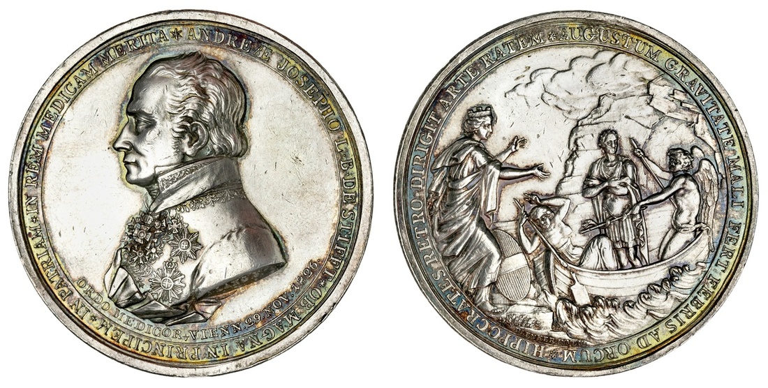 Austria Francis I (1804-1835). On the Recovery of Emperor Francis from his Illness, 1826. Medal. Silver, 48mm. By Joseph Nikolaus Lang. Uniformed bust left of the emperor's personal physician, Dr. Joseph Andreas Freiherr v. Stifft, rev. Turreted and robed Austria left welcoming back the emperor who is standing in a small boat rowed by an angel who points a serpent-entwined rod at Charon. Julius 1055, Horsky 7663, Storer 3433. Toned over some minor contact marks. Iridescent peripheral hues. Extremely Fine.