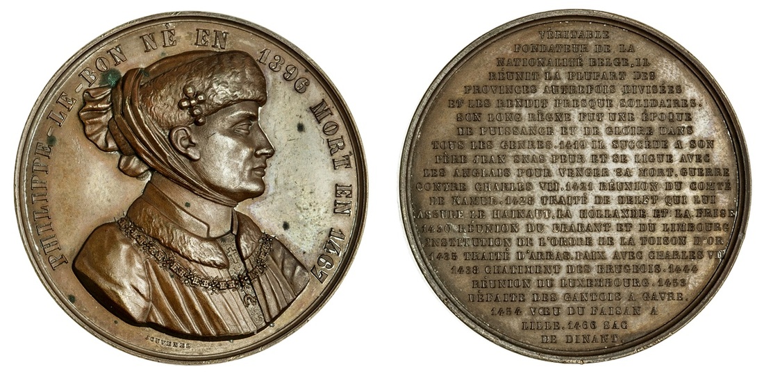 Belgium. Philippe le Bon. Medal. Bronze, 46.5mm. By Jouvenel, from his ca. 1840's series. Bust of the 15th Century Burgundian Duke right, rev. Long biographical legend. Uncirculated.