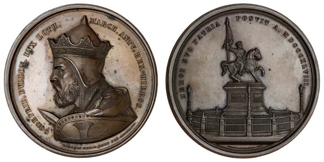 Belgium. On the Erection of the Statue of Godefroid de Bouillon in Brussels, 1848. Medal. Bronze, 73.6mm. 8mm thick. By Hart. Helmeted and crowned bust left wearing chainmail, holding sword and shield. rev. Equestrian statue of Godefroid, Marquis of Antwerp, Duke of Lorraine, King of Jerusalem, and one of the leaders of the First Crusade. Guioth I, 228. Extremely Fine.