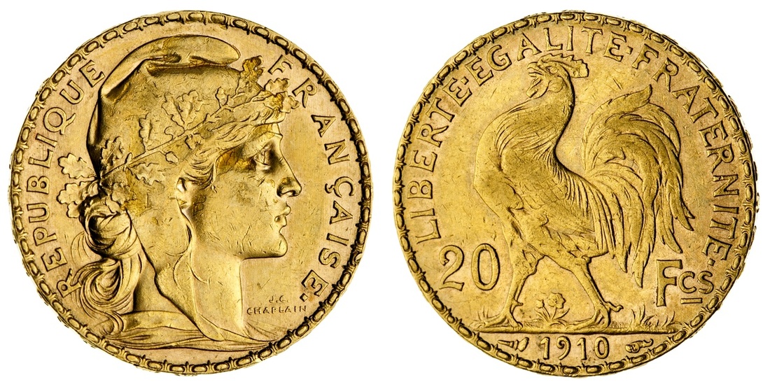 France. Third Republic. 20 Francs, 1910. Marianne head right, rev. Rooster left. KM 857. EF-AU.