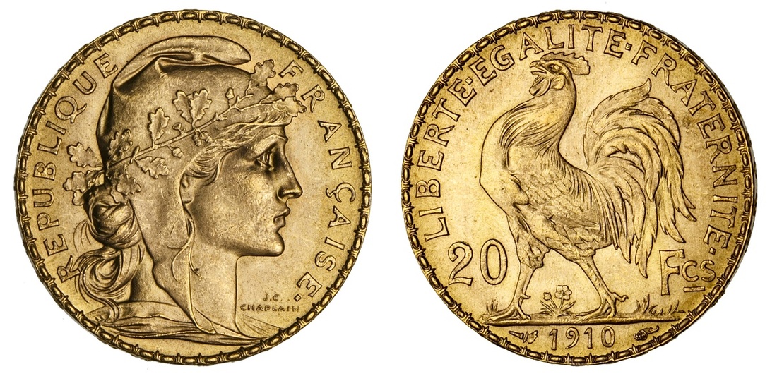 France. Third Republic. 20 Francs, 1910. Marianne head by Chaplain right, rev. Rooster left. KM 857. Uncirculated.