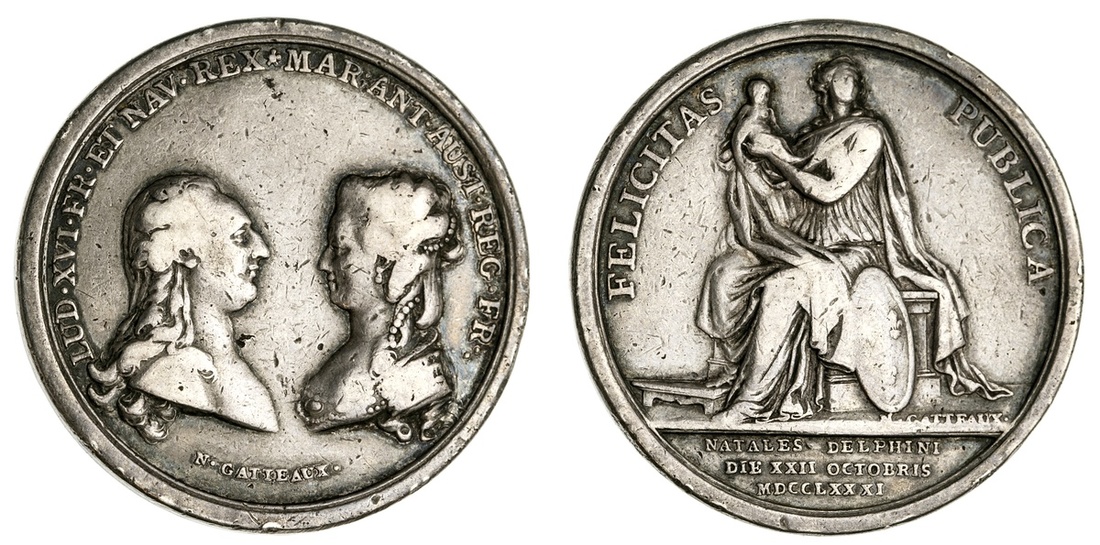 France. Louis XVI (1774-1793). On the Birth of the Dauphin, 1781. Medal. Silver, 34mm. By Gatteaux. Louis XVI and Marie Antoinette busts facing each other, rev. Gallia seated holding the infant Dauphin. Toned. About Very Fine.