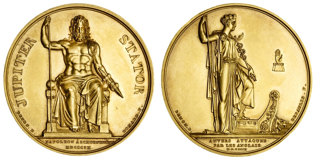 France. Napoleon (1804-1814). Napoleon's Stay at Schoenbrunn - English Attack on Antwerp, 1809. Medal. Gilt Bronze, 40mm. By Domard and Depaulis. Facing statue of enthroned Jupiter Stator, rev. Antwerp standing right, holding a scepter and winged caduceus, her foot set upon a prow adorned with the head of a hound. Plain edge. Bramsen 870, Julius 2128, Zeitz 102. Uncirculated.