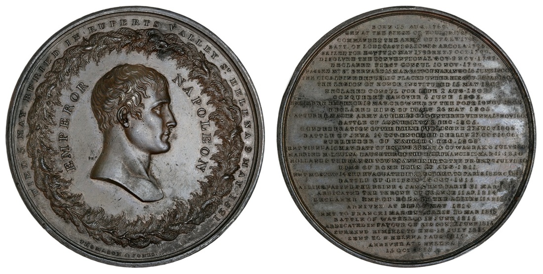 France. British Tribute Medal to Napoleon - His Death and Burial on St. Helena, 1821. Copper, 53.6mm. By Thomason and Jones, Birmingham. Bare head of Napoleon right; EMPEROR NAPOLEON, within wreath; DIED 5 MAY BURIED IN RUPERTS VALLEY ST. HELENA 9 MAY 1821, rev. Biographical details in 36 lines. Bramsen 1851, Essling 1678, Julius 3734. Normally found in White Metal, scarce in Copper. Extremely Fine.