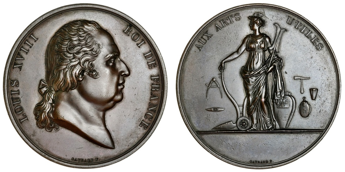 France. Louis XVIII (1814-1824). Aux Arts Utiles. Medal. Bronze, 56.3mm. By Gayrard. Head right, rev. Maiden standing facing, head left, with symbols of industry. Plain edge. Good Extremely Fine.